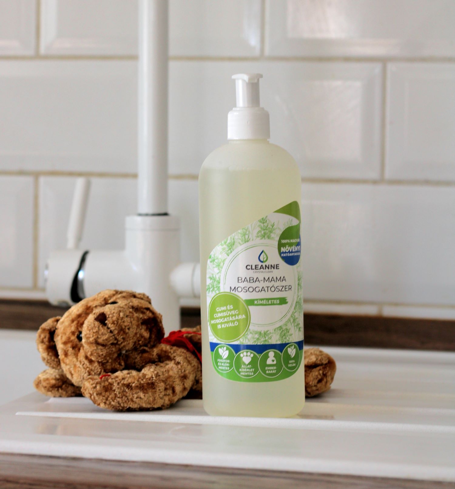 A Cleanne baba-mama mosogatószer biológiailag lebomló, környezetbarát összetevőkból áll, így “vegyszermentes” mivoltából adódóan alkalmas a cumik, cumisüvegek, gyermek étkészletek vagy akár játékok elmosogatásához is.