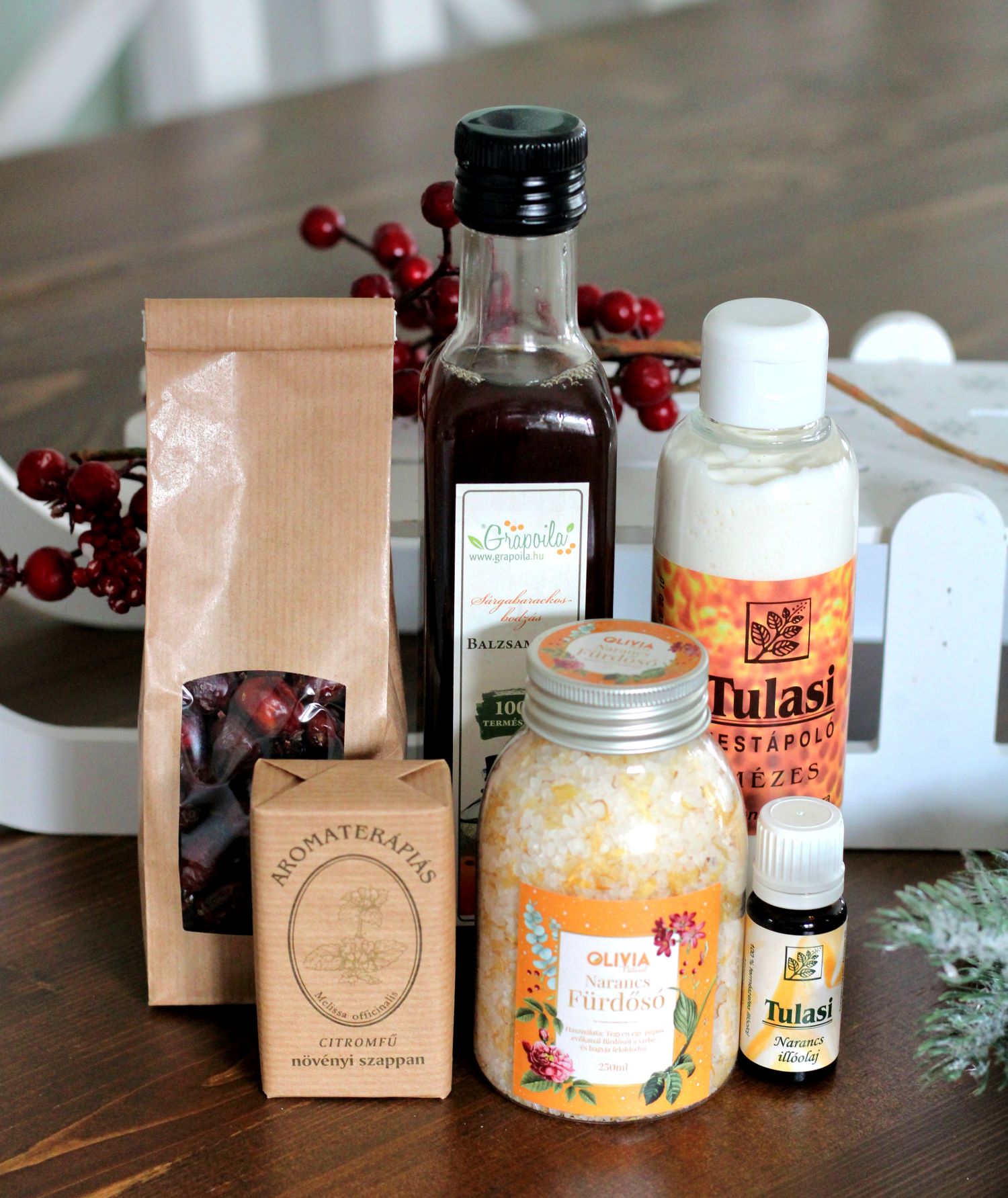 Citrusos-fűszeres illatvilágú ajándékcsomag, melyben a természetes kozmetikumok mellett különleges gasztroajándékok is feltűnnek.