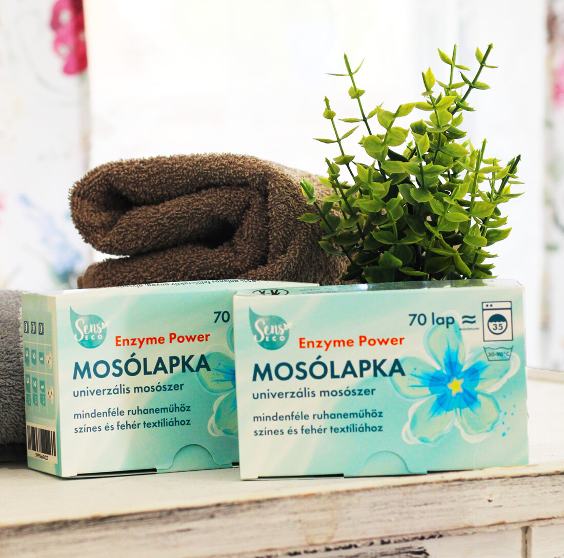 A SensEco Enzyme Power mosólapka egy parabén-, foszfát-, pálmaolaj-, és tartósítószermentes koncentrátum, mely 97 %-ban kókusz alapú mosóaktív anyagból áll. A lapkában található proteáz enzim segít a háztartásokban gyakran előforduló foltok (pl. sár, ételfoltok) hatékony eltávolításában.